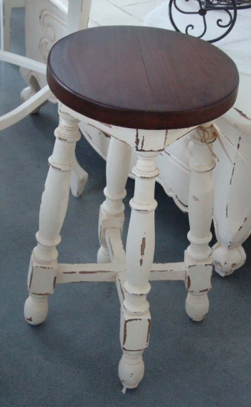 Stolička z mahagonového dřeva, bílá zestařená barva a hnědý sedák.