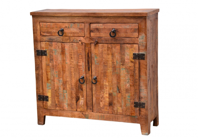 Přepychová hnědá Vintage skříňka s kovovým zdobením vás uchvátí na první pohled. Má spoustu úložného prostoru v podobě dvou skříněk s dvířky a dvou zásuvek. Toto Bufé vás kromě své praktičnosti a univerzálnosti zaujme i povrchem s jemnou patinou s tyrkysovými detaily, která zútulní každý prostor.