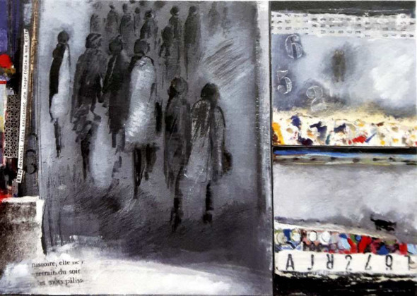 Obrázek 13x18, dvě postavy pod děšt...