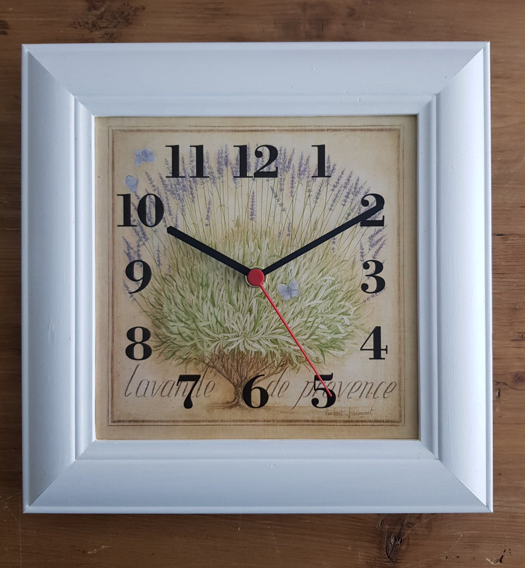 Rám je ručně natíraný s bílou patinou. Hodinový strojek je německý, na tužkovou baterii AA (není součást balení).