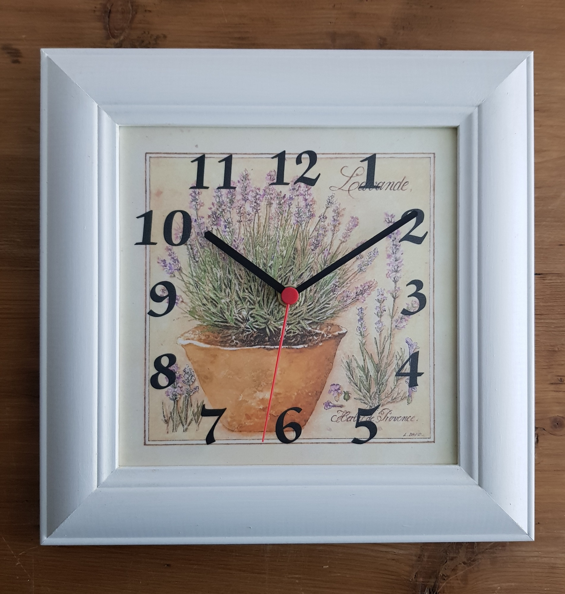 Rám je ručně natíraný s bílou patinou. Hodinový strojek je německý, na tužkovou baterii AA (není součást balení).