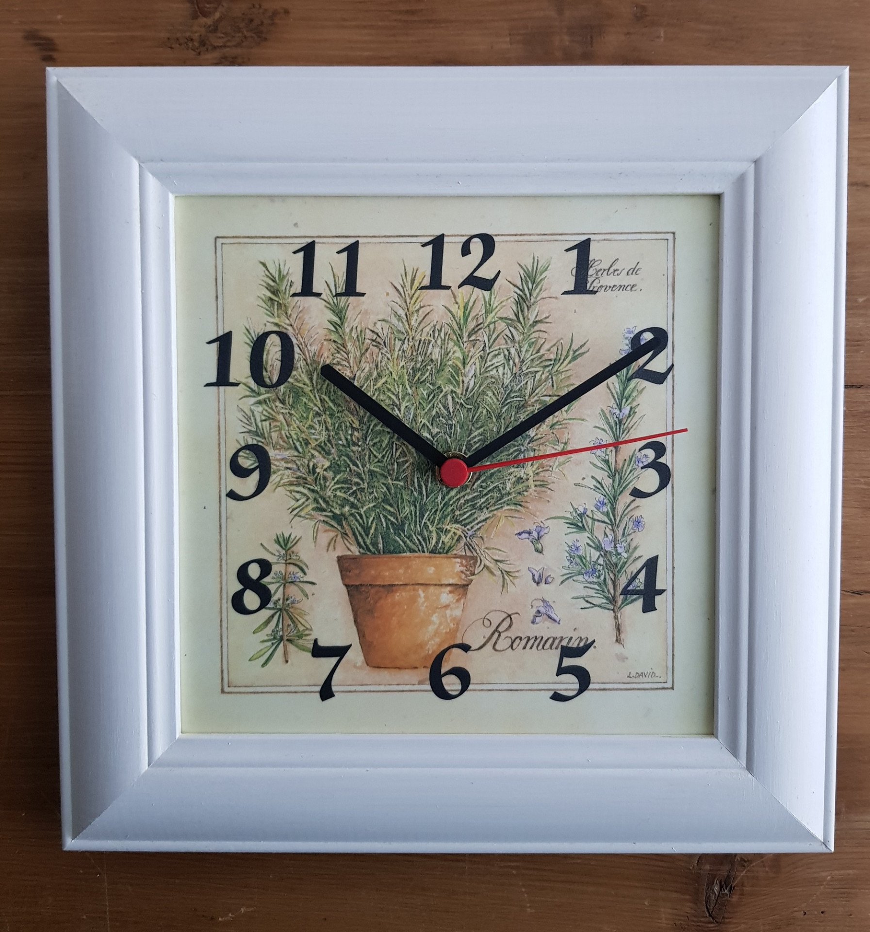 Hodiny 20 x 20 cm zarámovaný v ručně vyrobeném rámu.