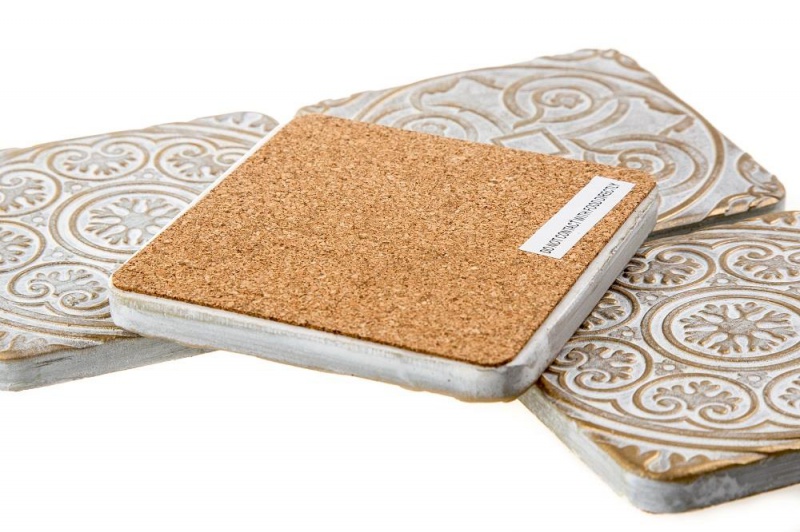 Čtyři kamenné podložky pod hrnky. Spodní strana podtácku je podlepena korkem.