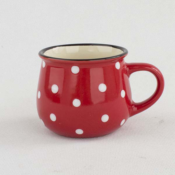 Keramický hrnek s puntíky červený, objem 230ml, rozměry: 11,7 × 7 × 7,8 cm.