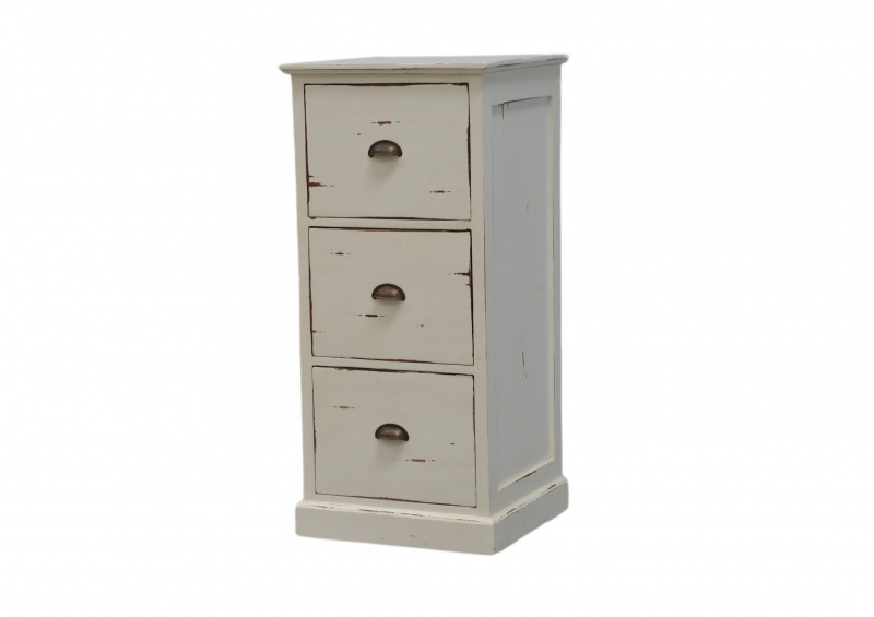 Komoda se třemi prostornými šuplíky je vyrobena z mahagonového dřeva v lehce odřené patině.