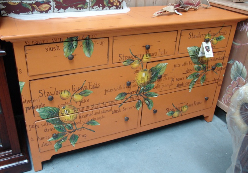 Komoda z mahagonového dřeva Aries je v oranžové barvě, na komodě jsou malované motivy ovoce. Komoda má 7 zásuvek.