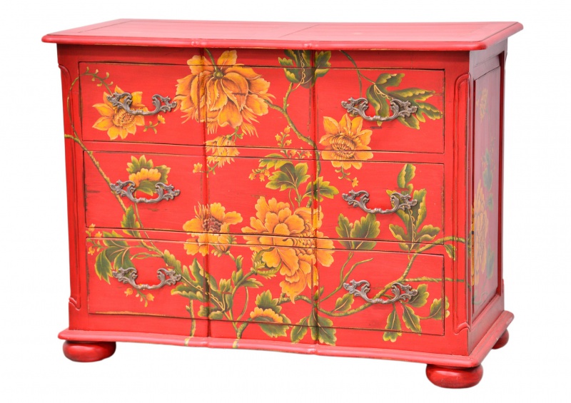 Velkým hitem v oblasti designu jsou v posledních letech kombinace minimalistických a univerzálních kousků s jedním výrazným designovým kusem, který se vyznačuje buď neobvyklým tvarem, použitým materiálem nebo netradiční barvou či vzorem. Tato nádherná provence komoda je ten poslední případ - kvalitní mahagonové dřevo v červené barvě je vyšperkované skutečně jemnou patinou a celý kus je ručně pomalován motivem velkých květin. Kontrast červeného základu a žlutých květů funguje skvěle! Komodu tvoří tři stejně velké zásuvky, které z tohoto moderního a efektního kousku dělají i praktický kus nábytku, který se neztratí ve vaší ložnici, obývacím pokoji ani chodbě či pracovně a každou místnost projasní! Buďte odvážní, sledujte trendy a nebojte se ve vašem interiéru trochu experimentovat!