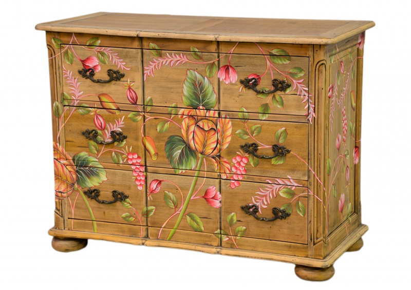 Toužíte-li po nevšední originalitě a skutečně exotickém kousku nábytku, který rozjasní vaši místnost a dodá jí relaxační, uklidňující a povzbuzující nádech, je komoda Bombe v přírodním provedení právě tím, co hledáte. Při každém pohledu na ručně malovanou květinovou kresbu vypínající se na jemném podkladu pískově žluté barvy, Vás zahltí pohoda a optimismus. Krásné kovové úchytky na otevírání a vkusné jednoduché vyřezávání určují tomuto kousku starobylé kouzlo. Tato exkluzivní komoda je vyrobena z mahagonového dřeva, což zaručuje její dlouholetou životnost, a disponuje třemi praktickými prostornými zásuvkami. Skvěle se hodí nejen do útulných uměleckých ateliérů, ale i do kreativně a exoticky vybaveného domova.