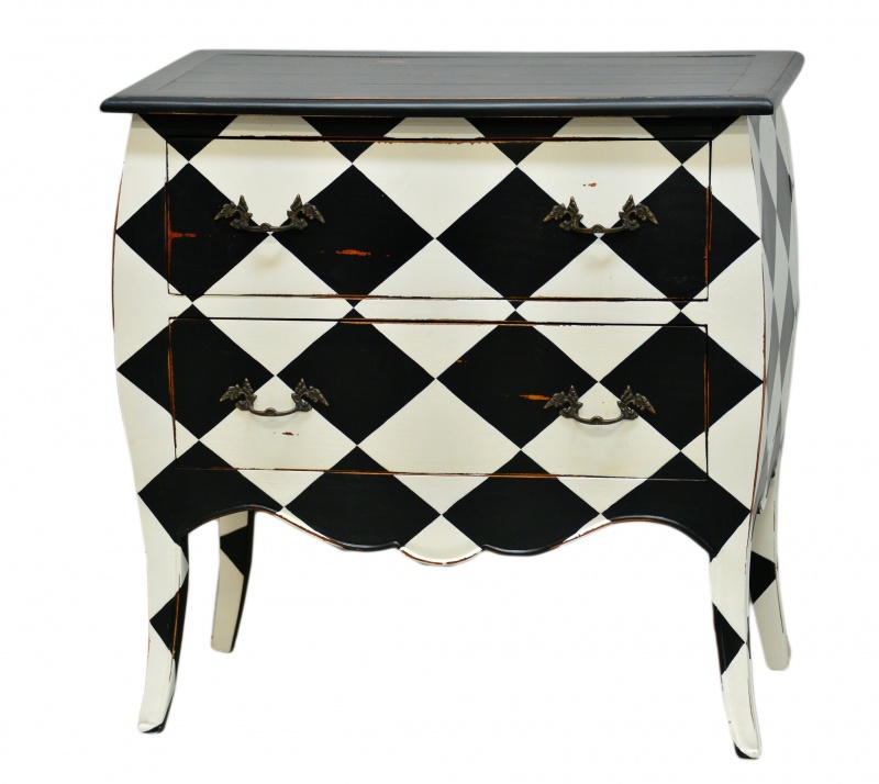 Perfekcionalismus, toto slovo přesně vystihuje neotřelou komodu Carina. Funkcionalistický károvaný pravidelný vzor v podobě černobílé šachovnice tvoří v kombinaci s jemným oblým tvarem komody esteticky neotřelý design tohoto atypického kousku. Lehké oprýskání a krásné kované úchytky navíc dodávají komodě starobylý ráz. Tato praktická komoda z kvalitního mahagonového dřeva s dvěma šuplíky je vhodným doplňkem pro zpestření jakéhokoli interiéru.