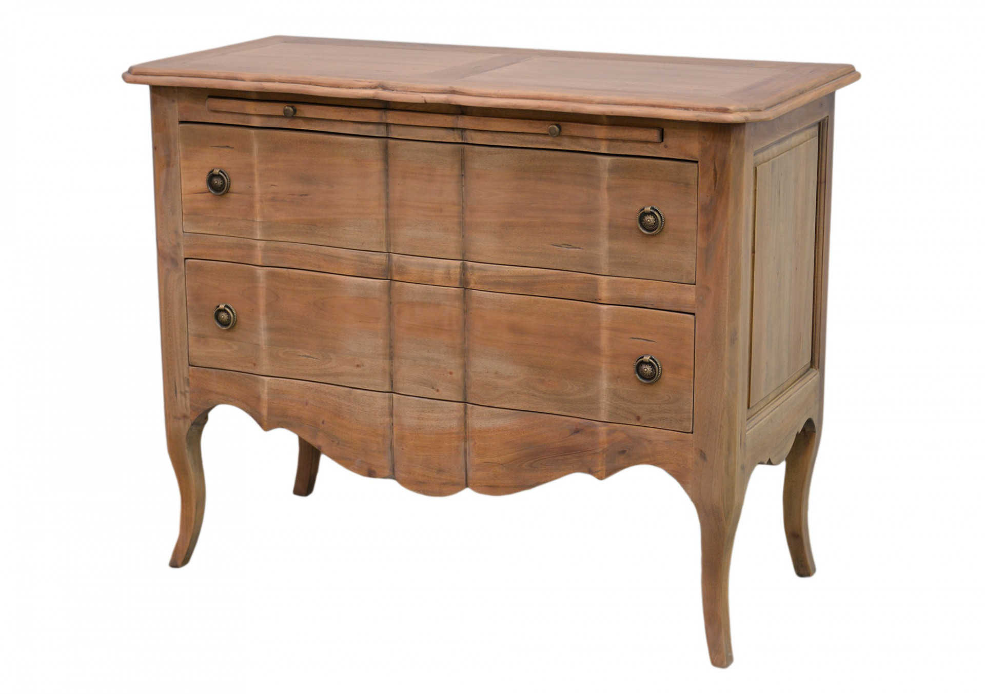 Perfekcionalismus - toto slovo přesně vystihuje neotřelou komodu Carina Middle. Barva komody v přírodním odstínu dřeva, spolu s krásnými, mosaznými úchytkami, tvoří v kombinaci s oblými tvary komody esteticky neotřelý design. Tato praktická komoda z kvalitního mahagonového dřeva s dvěma šuplíky a malou výsuvnou poličkou je vhodným doplňkem pro zpestření jakéhokoli interiéru.