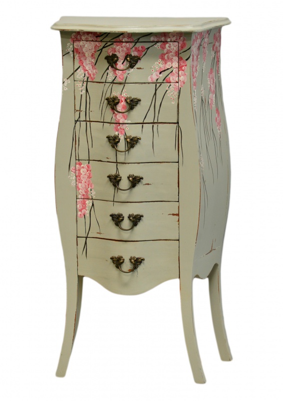 Ručně malovaná komoda Classis na první pohled ohromí svým elegantním svébytným rázem každého, kdo ji jen spatří. A to jen díky velmi vzorně promyšlené kombinaci barev, tónu, tvarů a doplňků, které dohromady tvoří dokonalé souznění a dávají tak duši i původně zdánlivě obyčejnému kousku nábytku. Tato skromná rozkošná komoda se šesti praktickými šuplíčky a nenuceným rozevlátým dojmem vnese do každého interiéru kouzlo panenské přírody a duchaplnou pohodu. Toužíte-li tedy po kouzelném éterickém doplňku, nenajdete vhodnějšího kousku, než této ručně malované komody s něžnými motivy kvítí a jemnými oblými tvary.