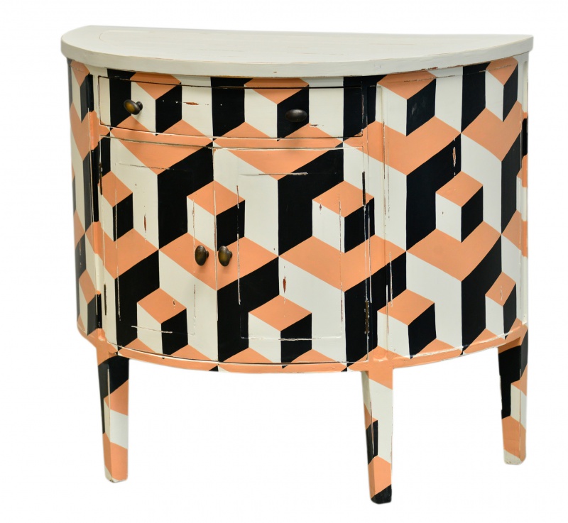 Jste milovníky avantgardních směrů dvacátého století? Pak si povšimněte naprosto unikátní a nenahraditelné komody Demi Lune, která se může pyšnit svým dokonale povznášejícím vzhledem. Kombinace ručně malovaného kubistického a funkcionalistického vzoru dává tomuto kousku ojediněle působivý dojem. Zajímavě půlměsíčitě tvarovaná komoda, vyrobena z velmi kvalitního dřeva tedy poslouží nejen po stránce estetické, ale také po stránce praktické. Obsahuje totiž úložný prostor za dvěma dvířky a jeden šikovný šuplík a jeho vrchní plocha navíc může skvěle posloužit jako vkusný podstavec pro puget květin a jiných bytových dekorací. Zpestřete tedy své obydlí jedním precizně a okázale zpracovaným kouskem!