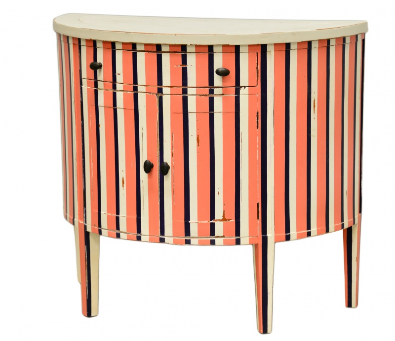 Nemusíte být milovníkem extravagance, abyste zanechali na tomto unikátním kousku zaujatý pohled. Extravagantní komoda Demi-Lune nedá nikomu šanci ji přehlédnout! Tříbarevný proužkovaný motiv v kombinaci s půlkruhovým tvarem definují společně nevšední unikát této exkluzivní komody. Komoda je vyrobena z kvalitního mahagonového dřeva, má dvoje dvířka a jeden šuplík. Probuďte interiér svého bytu za pomoci právě tohoto unikátu!