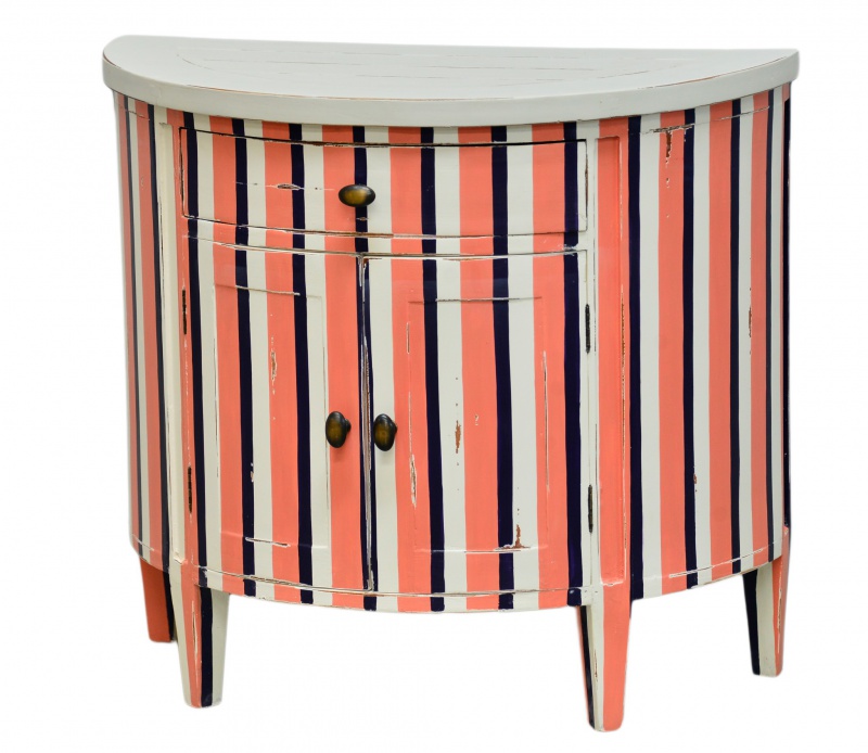 Přikrášlete některou z místností vašeho domu vkusnou a atypickou komodou Demi Lune. Pro komodu velmi nezvyklý půlměsíčitý tvar, pruhovaný motiv a netradiční, ač trefná kombinace barev. To jsou hlavní faktory, které společně s hladkým povrchem, udávajícím jednoduchou strohost, tvoří tento konkrétní kousek tak výjimečným a odlišným od ostatních. Komoda má dvoje dveře a jednu zásuvku s vkusnými drobnými úchytkami. Obohaťte svůj interiér o tento extravagantní a praktický kousek!