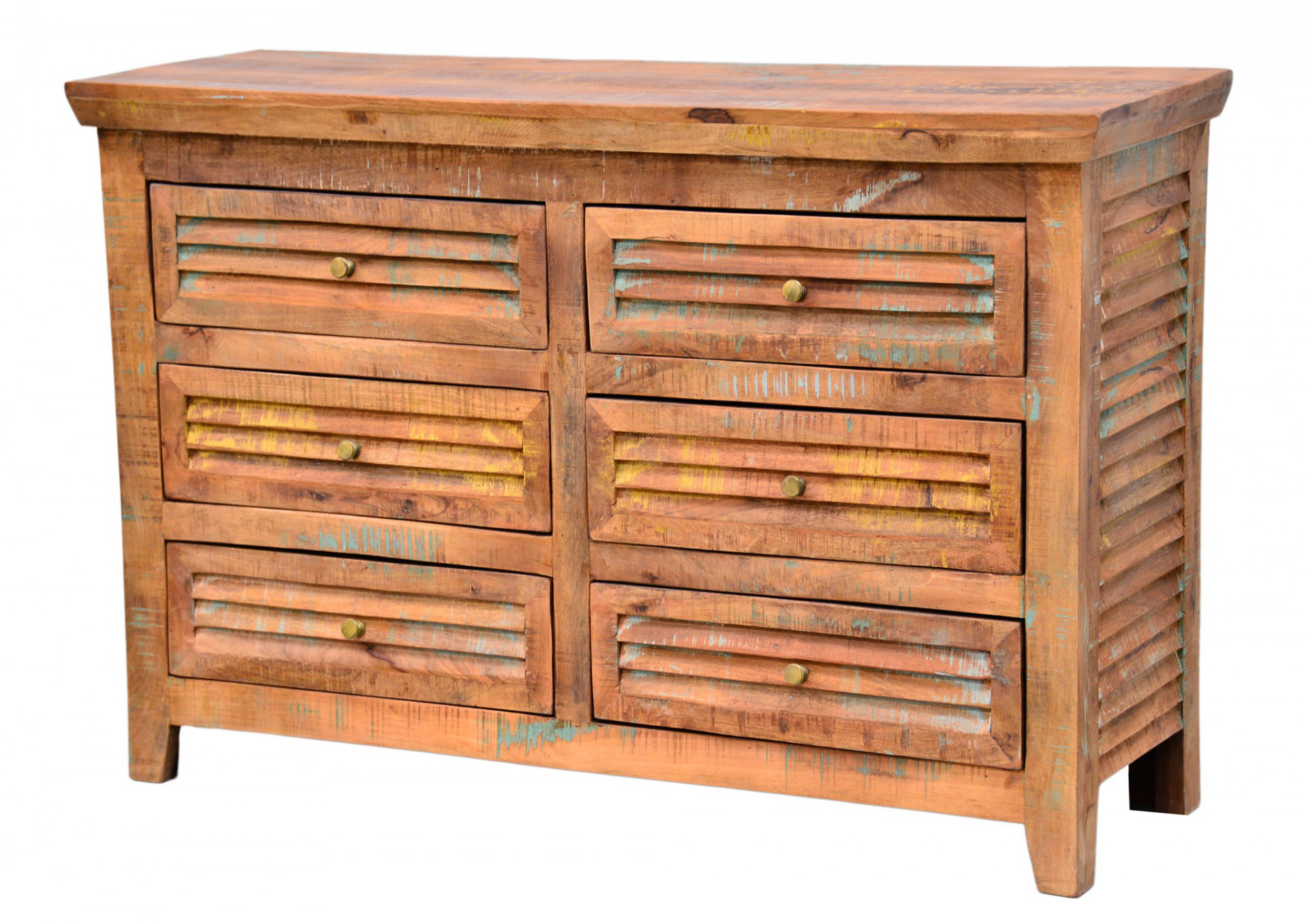 Baví vás barevný nábytek ale bojíte se, že se vám nebude hodit do interiéru? Nemusíte hned vybírat kousky s výraznými barvami a kontrasty, důkazem je tato nádherná vintage komoda s jemnou pestrobarevnou patinou, kombinující odstíny hnědé, žluté a modré barvy. Tato komoda s šesti zásuvkami se stane dominantou každé místnosti, která prozáří jakýkoliv prostor.