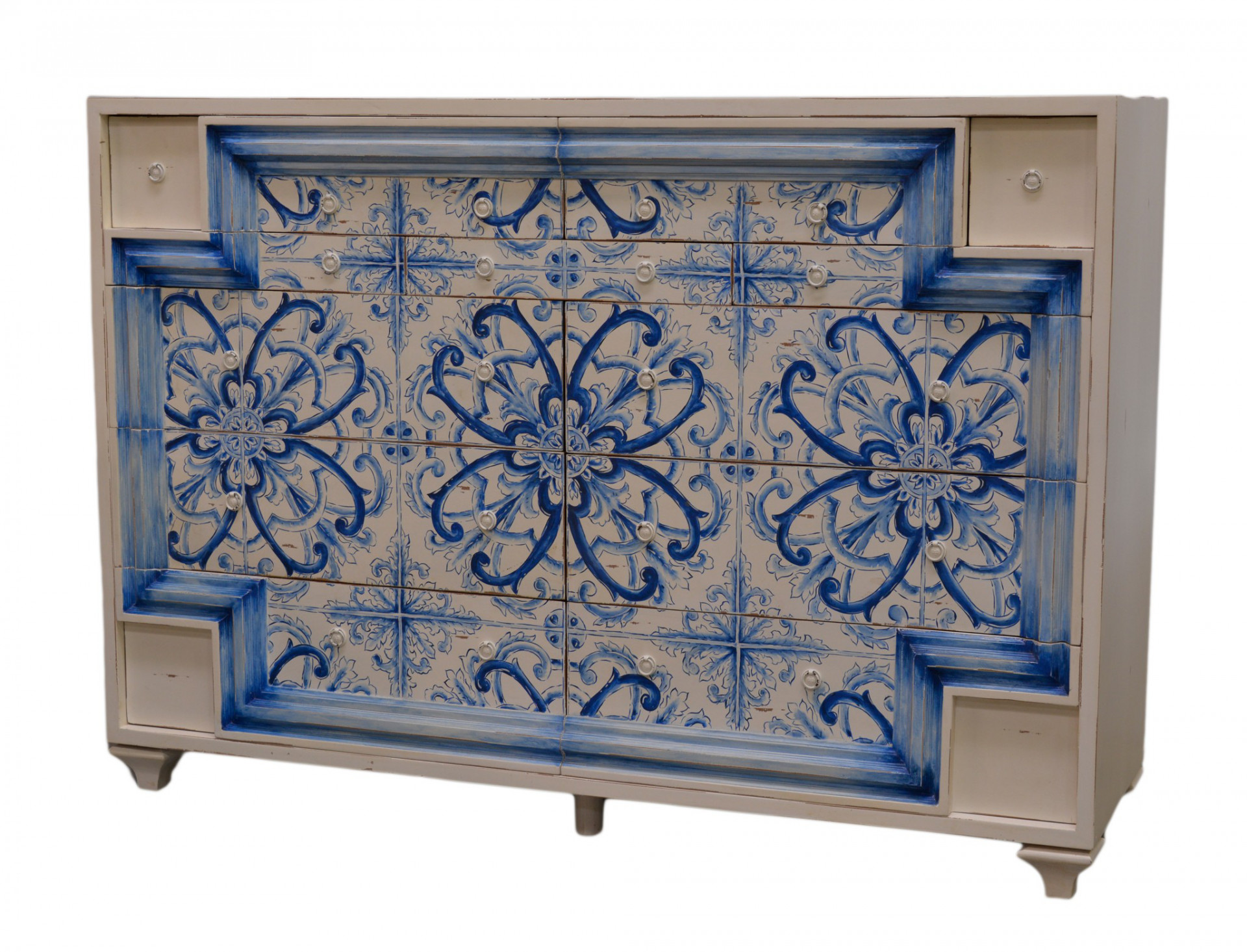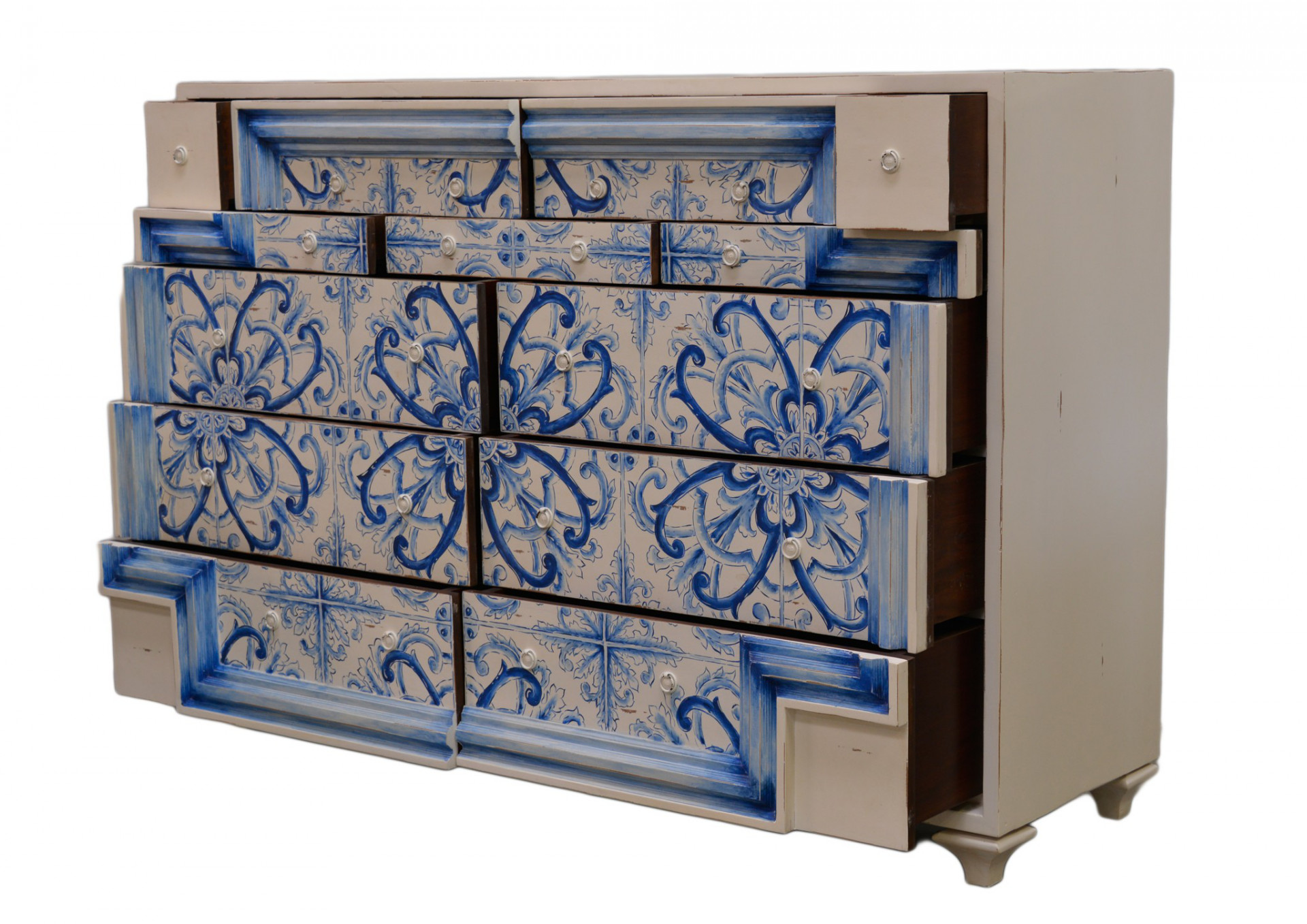 Jedna z nejvíce neobvyklých komod, která je v současné chvíli v nabídce našeho eshopu, je komoda Louvre. Komoda je vyrobena pouze z masivního dřeva, její povrch zdobí ručně malované motivy, které evokují malbu cibuláku. Tento úžasný kousek obsahuje celkem 13 šuplíků a nalezne si právě toho, kdo je největší fanoušek extrravagance.