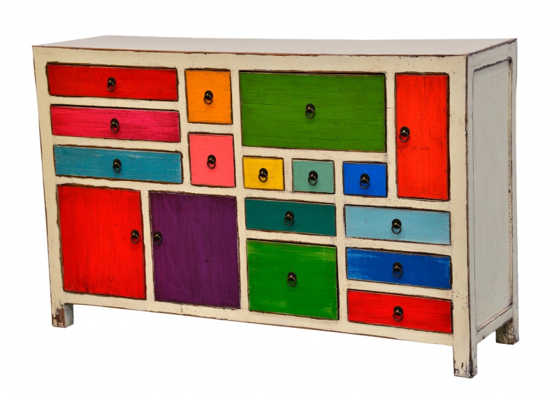 Pestrobarevnost a veselé barvy jsou vaší slabinou? Komoda Melanie je v tom případě přesně pro vás. Nádherně zpracovaná komoda v Provence stylu je vyrobena z masivního kvalitního dřeva, základ má bílou barvu s jemnou patinou a úložný prostor je rozdělen do čtrnácti pestrobarevných zásuvek a tří úložných prostorů s dvířky. Zásuvky mají odlišné tvary i velikosti, proto do této komody s přehledem uložíte všechno, co si chcete.