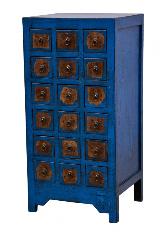 Chcete se doma cítit jako v krásném jiném světě, ve kterém je všechno exotické, nové a neokoukané? Pomoci vám k tomu může nádherná modrá komoda s osmnácti zásuvkami, které na sobě mají ručně malované čínské symboly. Je vyrobená z masivního dřeva, které je stabilní, kvalitní a má dlouhou životnost. Zútulněte touto skříňkou svou pracovnu, ložnici či obývací pokoj.