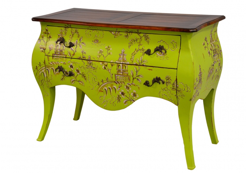 Při pouhém pohledu na tuto podivuhodnou a vskutku extravagantní komodu v exotickém provedení se člověku s trochou fantazie objeví před očima krásná, skvěle oděná gejša s šálkem kvalitního čínského čaje v ruce. No neříkejte, že ve vás tato více než atypická komoda nevyvolává představu staré dobré vzdálené Číny? Krásný malovaný vzor na výrazném zeleném podkladu a oblé dynamickými tvary jen podtrhují nesmírně exotické kouzlo tohoto kousku. Exkluzivní komoda Nice v zelené barvě s hnědou deskou, je vyrobena z mahagonového dřeva a má dva prostorné šuplíky. Naprosto nevšední originalitu hravě dodá každé místnosti, která bude mít tu nadstandardní čest!