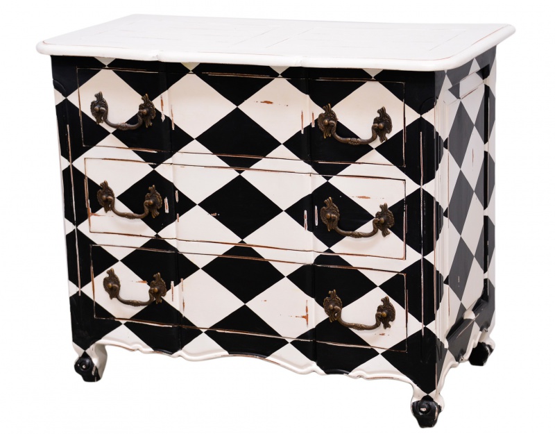 Jemná a romantická provence komoda se hodí do obývacího pokoje, ložnice i předsíně. Ladně tvarované lemy ve spodní části nábytku a precizní zpracování mahagonového dřeva dělají z tohoto kousku poklad, které si zamilují především dámy. Černo-bílé kostky s decentní patinou, kované úchyty a nadčasový design sedí do jakéhokoliv interiéru, ať už moderního nebo tradičního.