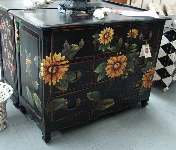 Velkým hitem v oblasti designu jsou v posledních letech kombinace minimalistických a univerzálních kousků s jedním výrazným designovým kusem, který se vyznačuje buď neobvyklým tvarem, použitým materiálem nebo netradiční barvou či vzorem. Tato nádherná provence komoda je ten poslední případ - kvalitní mahagonové dřevo v černé barvě je vyšperkované stylovou patinou v hnědém odstínu a celý kus je ručně pomalován motivem velkých slunečnic. Kontrast černého základu a žlutých květů funguje skvěle! Komodu tvoří tři velké zásuvky, které z tohoto moderního a efektního kousku dělají i praktický kus nábytku, který se neztratí ve vaší ložnici, obývacím pokoji ani chodbě či pracovně! Buďte odvážní, sledujte trendy a nebojte se ve vašem interiéru trochu experimentovat!