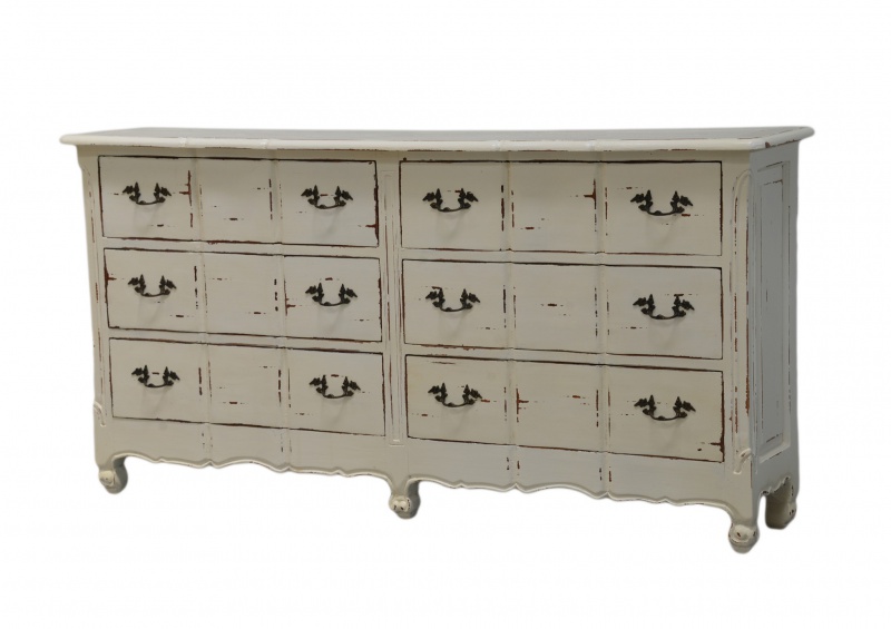 Přepychová komoda Provincial je dlouhá a praktická komoda, která si Vás díky své originalitě získá na první pohled. Je vyrobena z kvalitního masivního mahagonového dřeva, což zaručuje nosnost a kvalitu, a provedena v bílé, jemně zastřené patině. Komoda obsahuje šest prostorných zásuvek, do kterých leze uložit oblečení i dokumenty, tudíž se hodí například do obývacího pokoje, ložnice i pracovny. Jemné vkusné vyřezávání ve spodní části skřínky a zdobná madla z ní dělají luxusní kousek, nad kterým se každý s obdivem a úžasem pozastaví, a který nadchne i absolutní flegmatiky. Interiéru bezpochyby dodá nevídanou originalitu a podpoří starobylost jeho vzhledu ve stylu Provence.