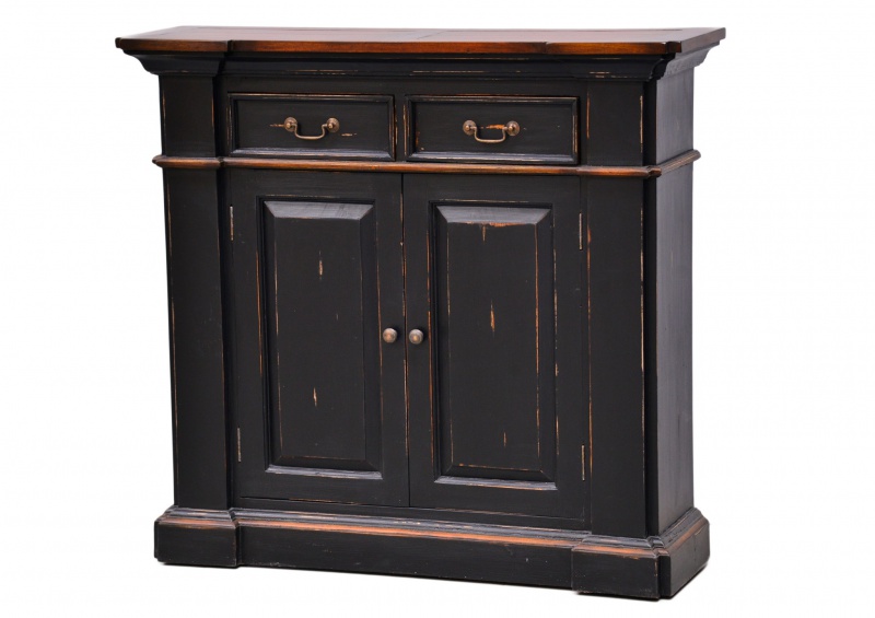 Kouzelná komoda Roosevelt v černé barvě, s hnědou deskou a akcentem hnědé barvy na hranách působí unikátním dojmem. Komoda má dva šuplíky a dveře, je vyrobena z mahagonového dřeva.
