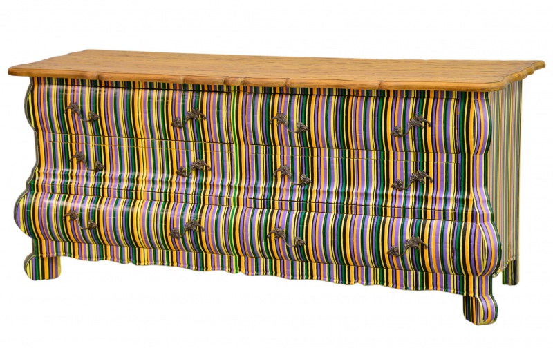Extravagance je to, co hledáte? Pak se na první pohled zamilujete do této pruhované komody Serpentine, která se vám nikdy neokouká. Kombinace několika barev ve svislých pruzích, vyřezávání po stranách a zakulacené spodní zásuvky dodávají skřínce na zajímavosti. Přírodní odstín desky a kovové úchyty s motivem listů ji zase přidávají na eleganci. Nebojte se výstřednosti a zařaďte tento kousek do vašeho interiéru, každý ho bude obdivovat!
