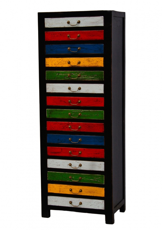 Chcete mít pořádek ve vašich dokumentech či špercích? Pořiďte si originální komodu Tower s pestrobarevnými zásuvkami, které zajistí, že už nikdy nebudete muset nic zoufale hledat. 15 úzkých zásuvek v 5 různých barvách je doplněno krásnými kovovými úchyty, které vám usnadní manipulaci s šuplíky. Nebojte se neotřelého výrazného vzhledu a rozzařte vaši pracovnu, šatnu či ložnici.