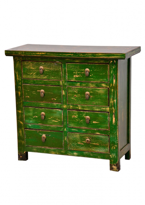 Zelená komoda s výraznou a nepřehlédnutelnou patinou a krásnými kovovými úchyty se stane vaším oblíbeným kouskem nábytku hned na první pohled. Je vyrobena z luxusního masivního dřeva, které má dlouhou životnost a s léty navíc ještě krásní. Nebojte se výrazné zelené barvy a pořiďte si neotřelý Vintage kousek.