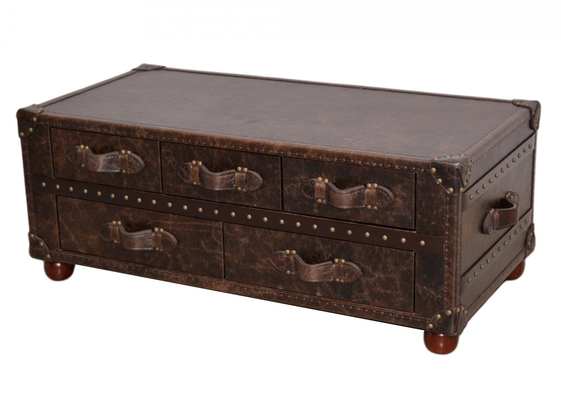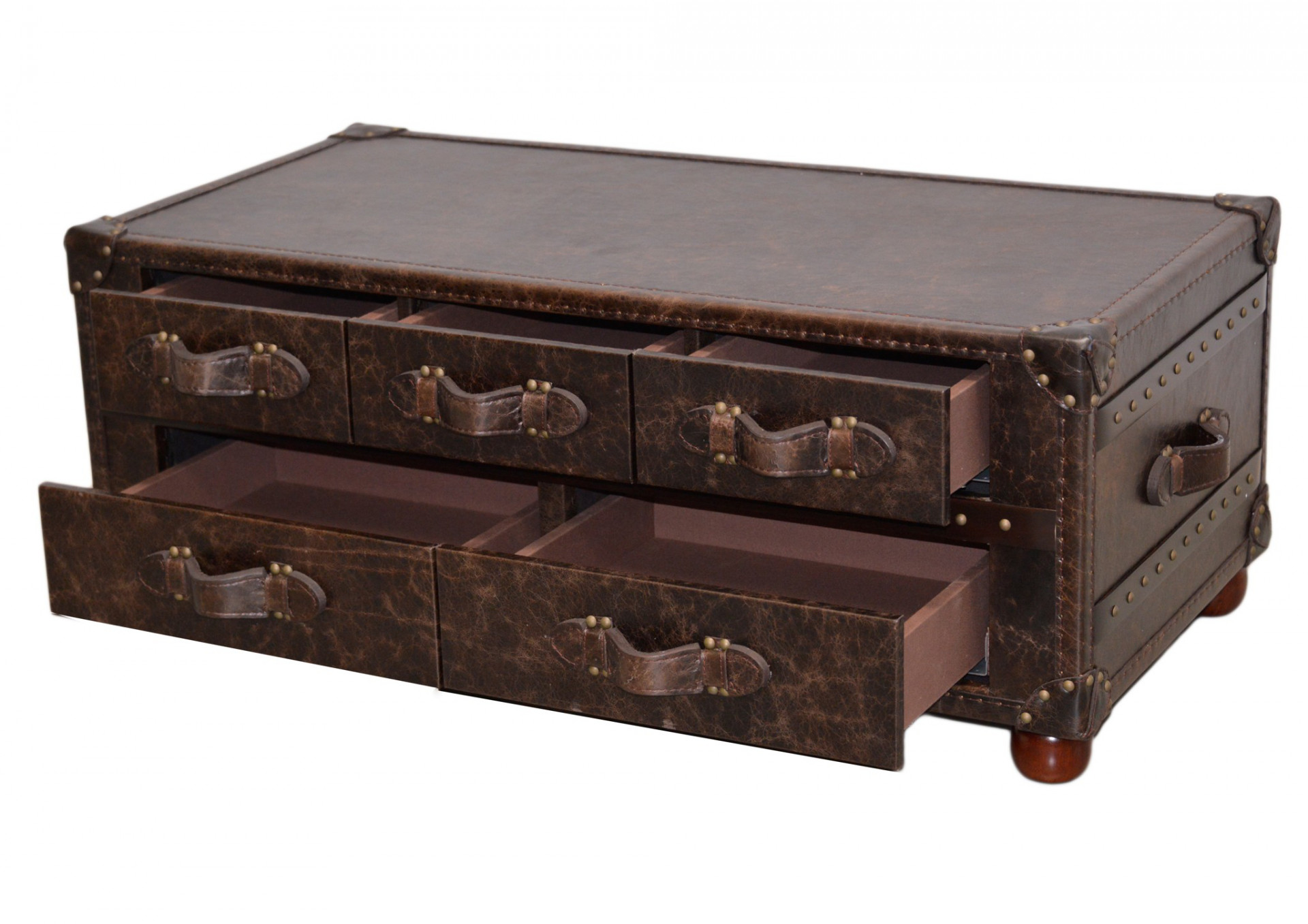 Zajímavé kousky si vždy najdou svého zákazníka. To se musí říct i o tomto konferenční stolku v tmavě hnědé vintage kůži! Stolek je vyroben z masivího dřeva, pravá hovězí kůže na jeho povrchu z něho dělá naprostý designový unikát. Stolek obsahuje celkem pět šuplíků, na bocích stolku jsou krásná a praktická madla.