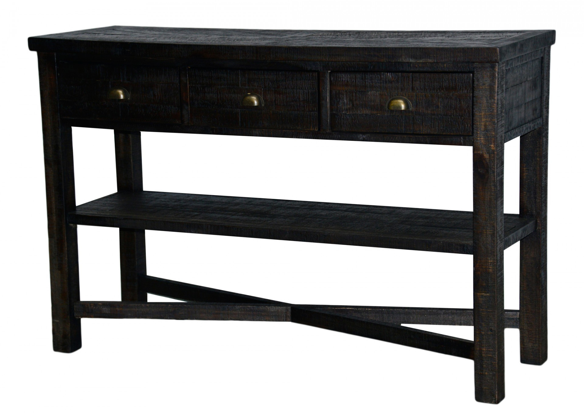 Netrpělivě projíždíte internetové obchody s nábytkem, ale stále nenarážíte na to pravé? Tento okázalý konzolový stolek může vše okamžitě změnit! Tento kousek vyniká svým dokonale působivým vzhled – nevtíravě jednoduchý a decentní, ale přesto impozantně působící a nápaditý! Nadčasový design tohoto stolku umocňuje především jeho tmavá patina překrývající přírodní motiv velmi kvalitního dřeva, ze kterého je stolek vyroben a skvěle řešené designové uspořádání, které ideálně doplňují vkusné zlatavé úchytky. Jako vhodný úložný prostor na veškeré dokumenty poslouží tři rozkošné šuplíčky a odkládací plochu lze doplnit například proutěnými košíky. Vsaďte na nevšední originalitu a výjimečnou kvalitu!