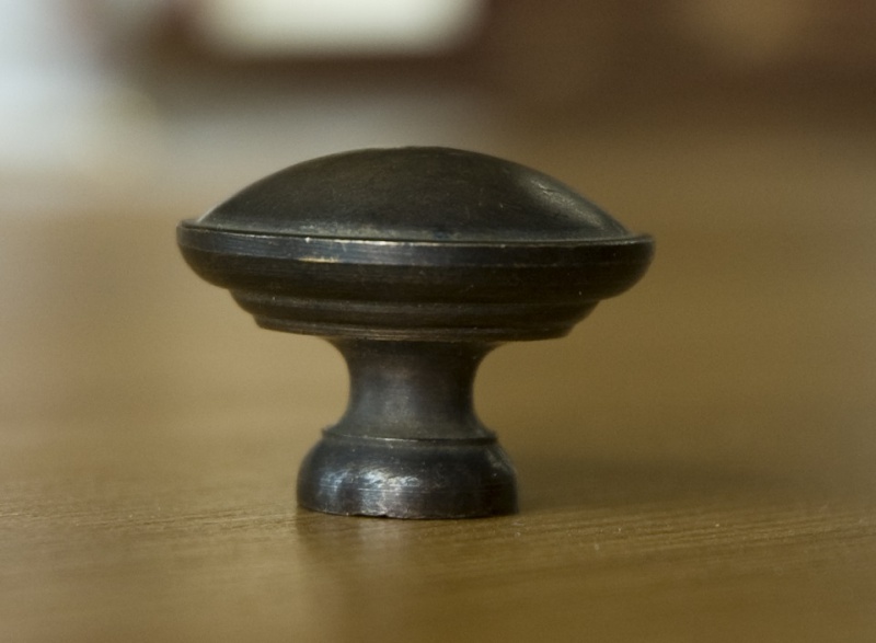 Kovová úchytka mosazná, střední, tvar čočka, dodáváno se sřoubem. Průměr 30mm, výška 22mm.