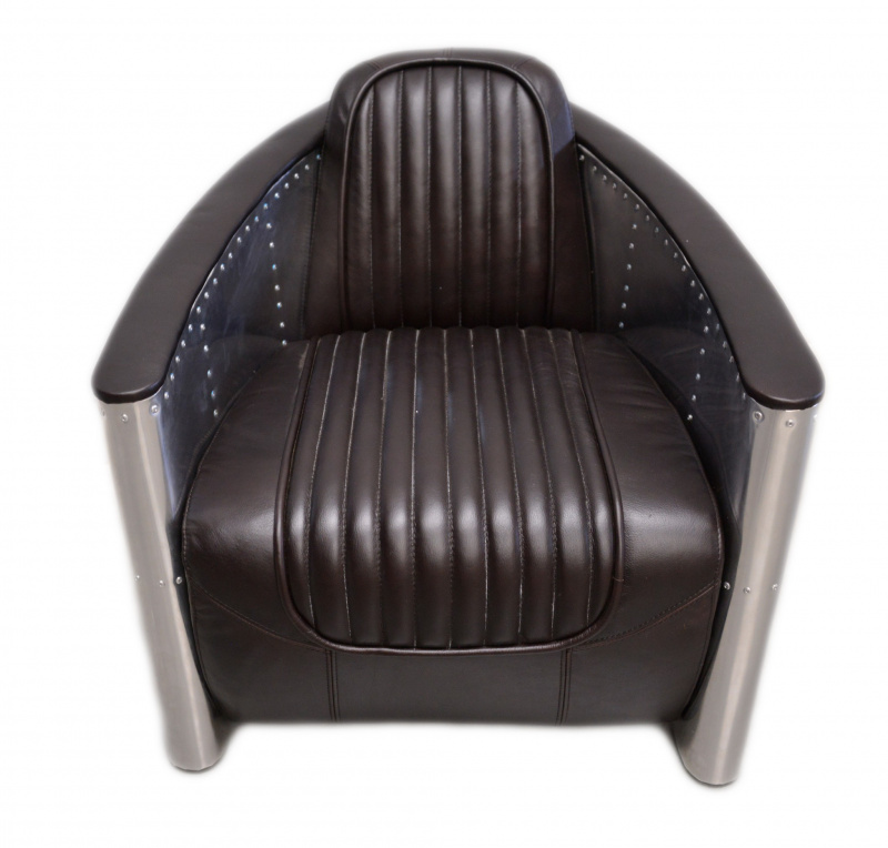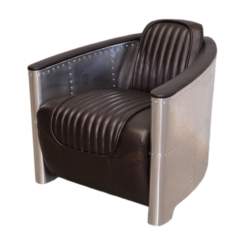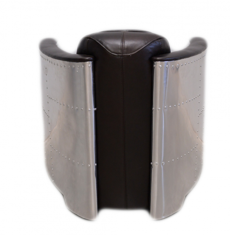 Kožené křeslo Aviator s jedinečným designem se stane oblíbenou součástí vašeho domova. Vintage křeslo vyrobené v tmavě hnědé kůži má netradičně zpracované opěrky ze stříbrného plechu, který dělá z křesla kousek pro skutečné fajnšmekry. Neotřelý design připomíná trup letadel ze 70. let, zpracování je unikátní, jsou vidět poctivé staré nýty a původní spoje. Originální křeslo se nejlépe hodí do obývacího pokoje, použít ho však můžete i do předsíně či ložnice. Nebojte se extravagance a trochu zaexperimentujte!