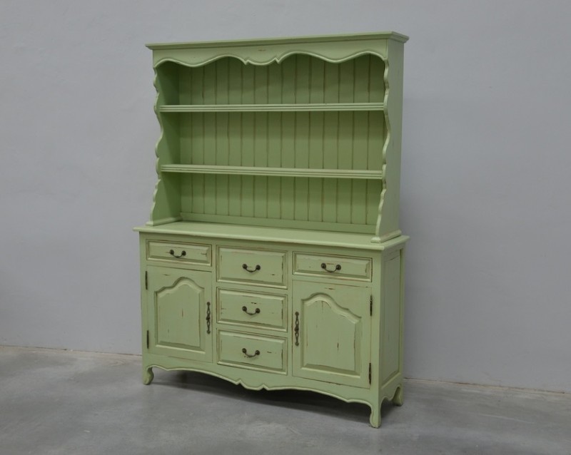 Kredenc Farmhouse vyrobený z mahagonového dřeva se skládá ze dvou dílů, barva kredence je pistáciová patina.