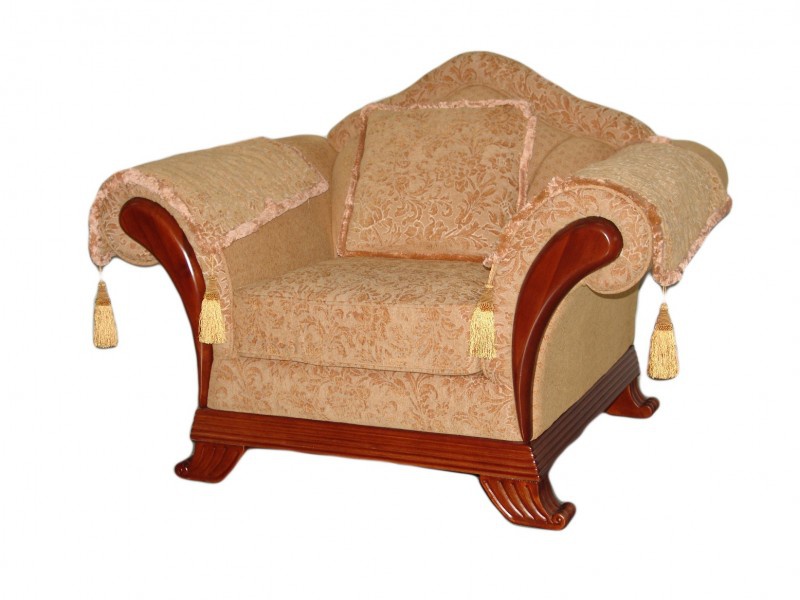 Křeslo potažené látkou, zdobné motivy, vyřezávané nohy. Kostra je dřevěná.