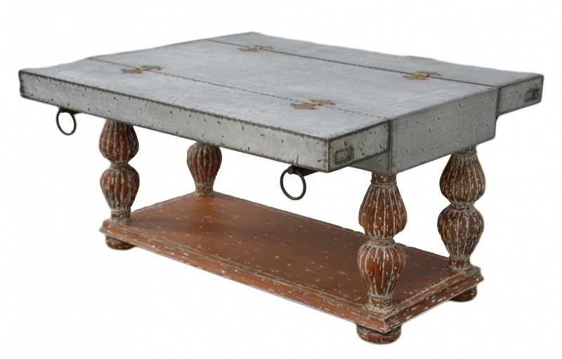 Exkluzivní kuchyňský ostrov s oplechovaným vrškem je vyroben z mahagonového dřeva. Stolek je rozložitelný a má výsuvné podpěry pod rozložitelné plochy.