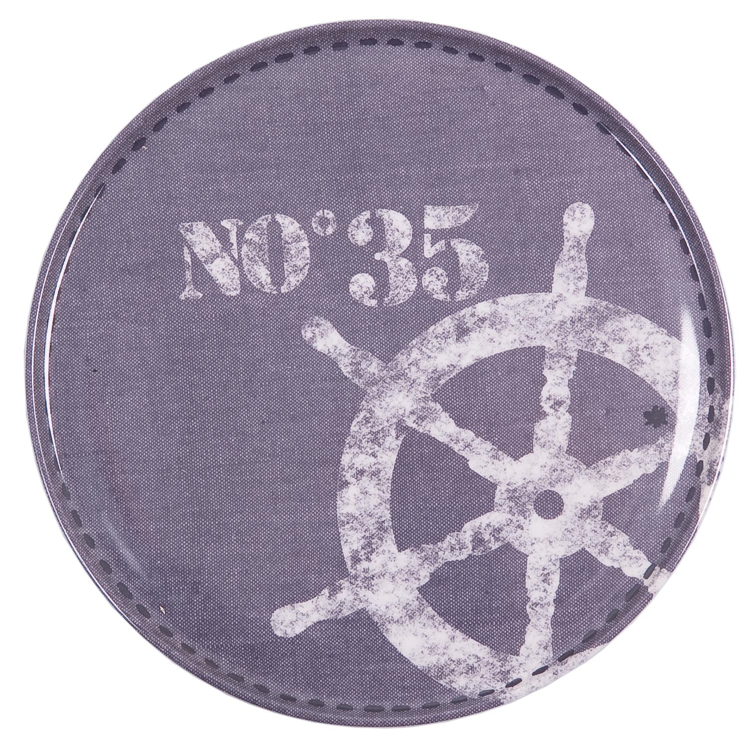 Fialovo-bílý kulatý podnos s číslem.