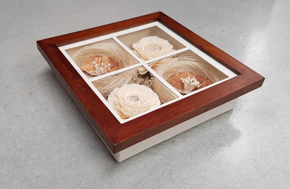 Ručně vyráběné květiny z přírodního materiálu v dřevěném boxu.