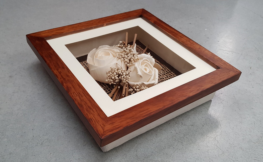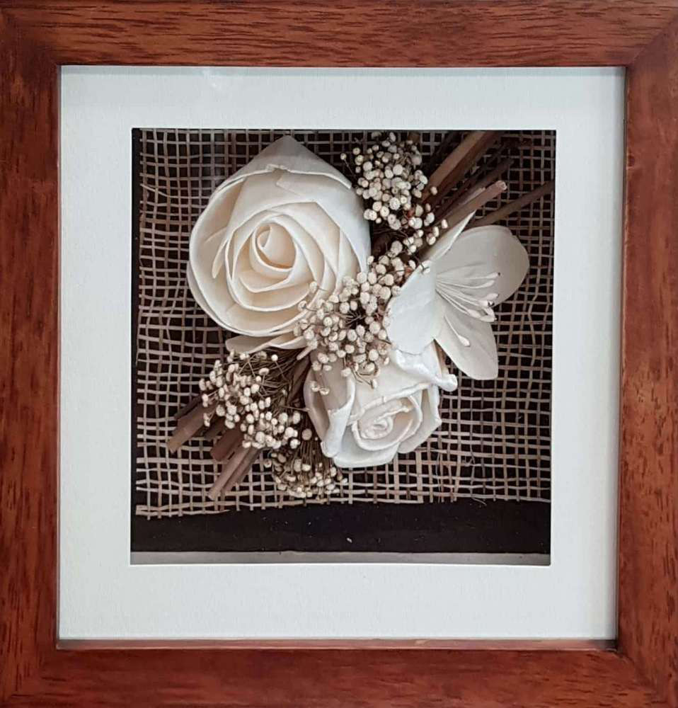 Ručně vyráběné květiny z přírodního materiálu v dřevěném boxu.