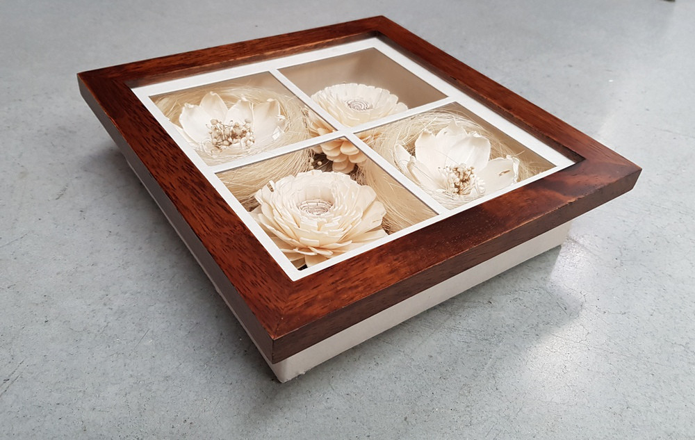 Ručně vyráběné květiny z přírodního materiálu v dřevěném boxu.