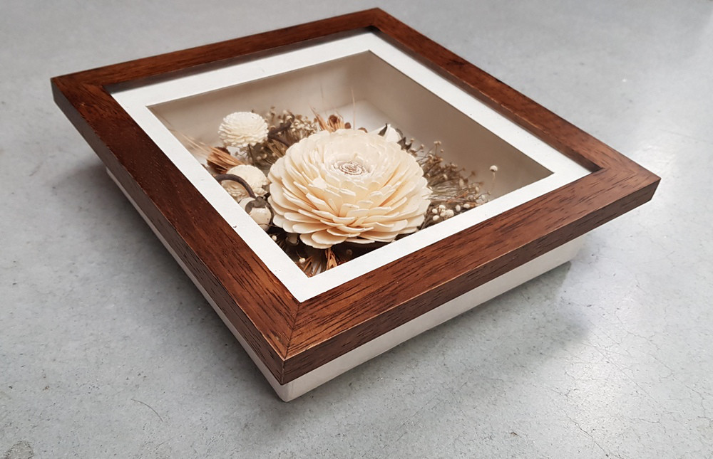 Ručně vyráběné květiny z přírodního materiálu v dřevěném boxu.