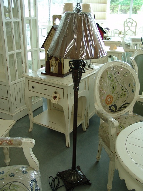 Stojací stylová lampa, kovová, tmavě hnědý širm. Rozměry lampy: výška 150 cm, průměr širmu 51 cm.