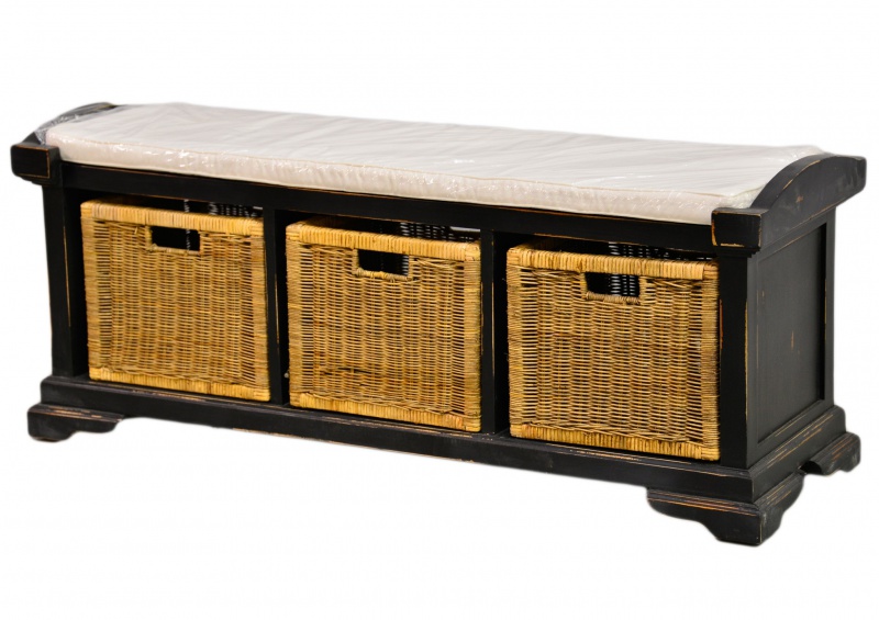 Nepodceňte originalitu v designu Vašeho domova a dostatečné pohodlí! Každý má právo dopřát si alespoň trochu luxusu a zaslouží si pohlazení pro oči i duši. Sníte-li tedy o všech těchto výhodách, a chcete-li vnést Vašemu domovu trochu venkovské starobylosti a ledabylé elegance, je lavice Homestead stvořena právě pro Vás. Vyrobena je z masivního mahagonového dřeva a přisvojuje si černou barvu s oprýskaným efektem. Obsahuje praktické úložné prostory ve formě tří prostorných ratanových košíků a na ploše určené pro sezení, je umístěn měkký podsedák. Doplňte svou předsíň, nebo chodbu okouzlujícím kouskem, vyzařujícím hřejivou prostotou, určující specifickou neotřelou a ojedinělou krásu!