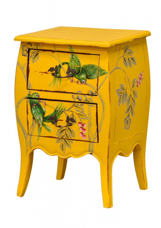 Chcete-li dodat své ložnici šmrnc, ale bojíte se, že to přeženete, zkuste to jinak, než barevnými tapetami nebo výrazným povlečením! Pořiďte si noční stolky Carina v provence stylu, které se díky své jedinečnosti stanou krásnou ale nevtíravou dominantou vaší ložnice. Stolek je vyroben z mahagonového dřeva, má dvě praktické zásuvky s elegantním kováním a jednoduché romantické vyřezávání ve spodní části. Stolek je vyroben ve žluté barvě s jemnou patinou, zdobený nádhernými malbami papoušků a květin, které zaujmou na první pohled. Nebojte se experimentů a vyzkoušejte tento netradiční kousek, krásně zapadne do světlého i tmavého interiéru!