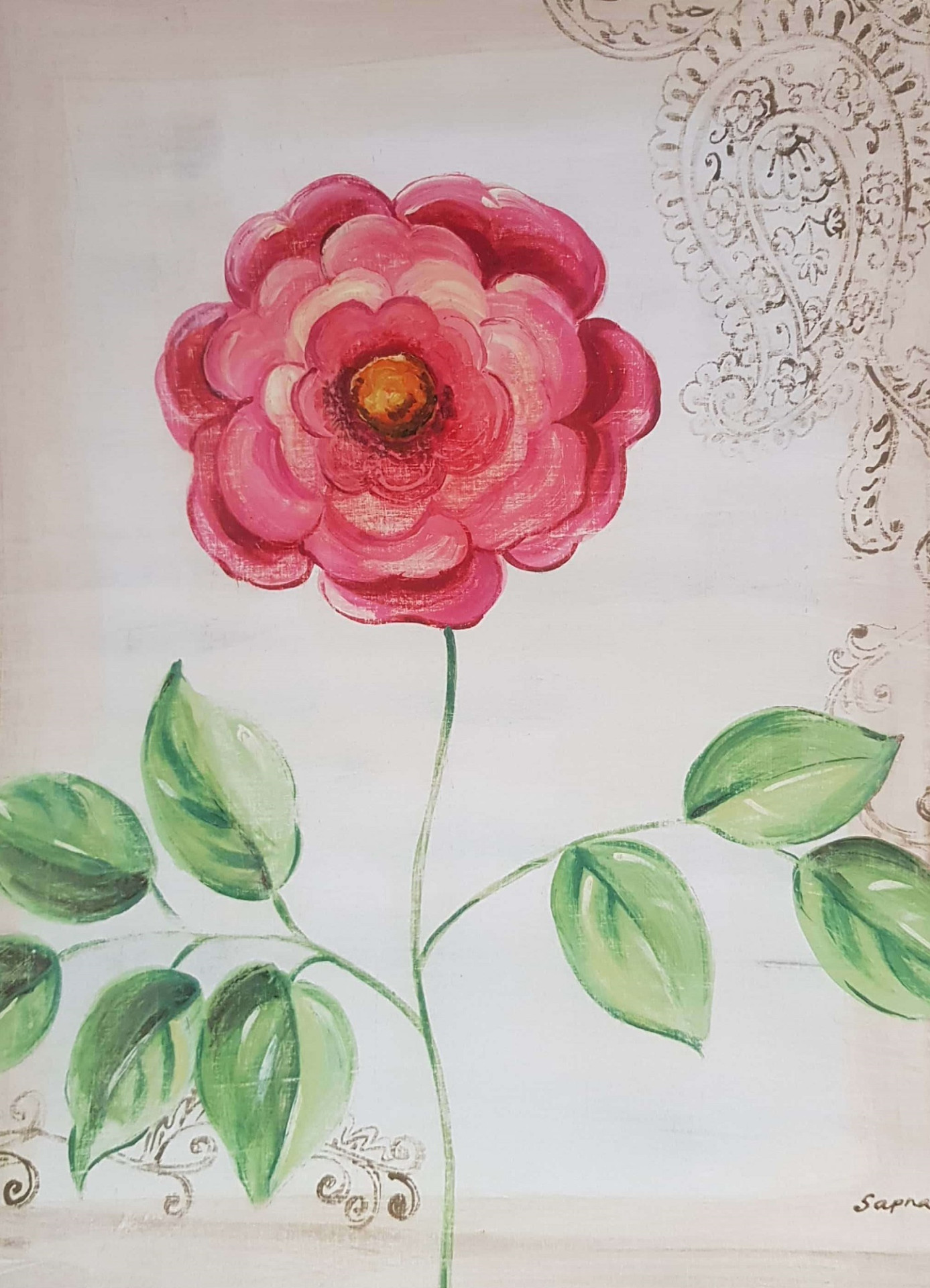 Obrázek 18x18, červenobílá pivoňka, rám bílý s patinou