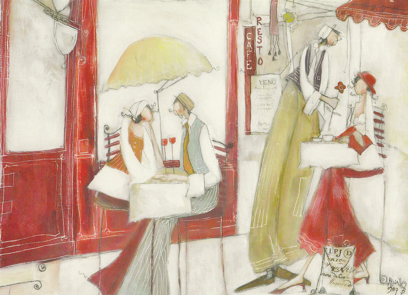 Obrázek 13x18, postavy v kavárně, rám bílý s patinou