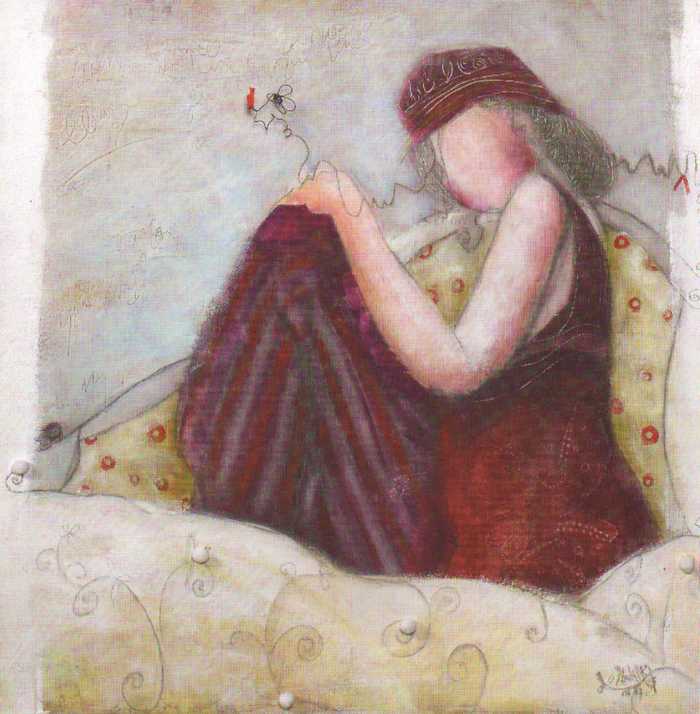 Obrázek 14x14, postava na posteli, rám sv. dub - červotoč
