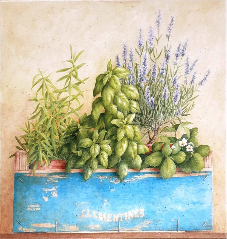 Obrázek 14x14, truhlík bylinek I., rám bílý s patinou