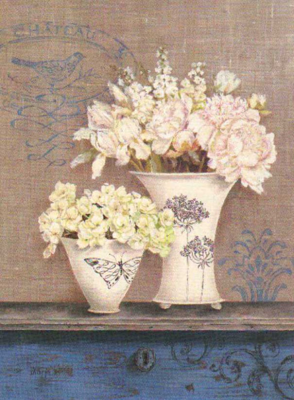 Obrázek 17x22, květiny na modré komodě, rám bílý s patinou